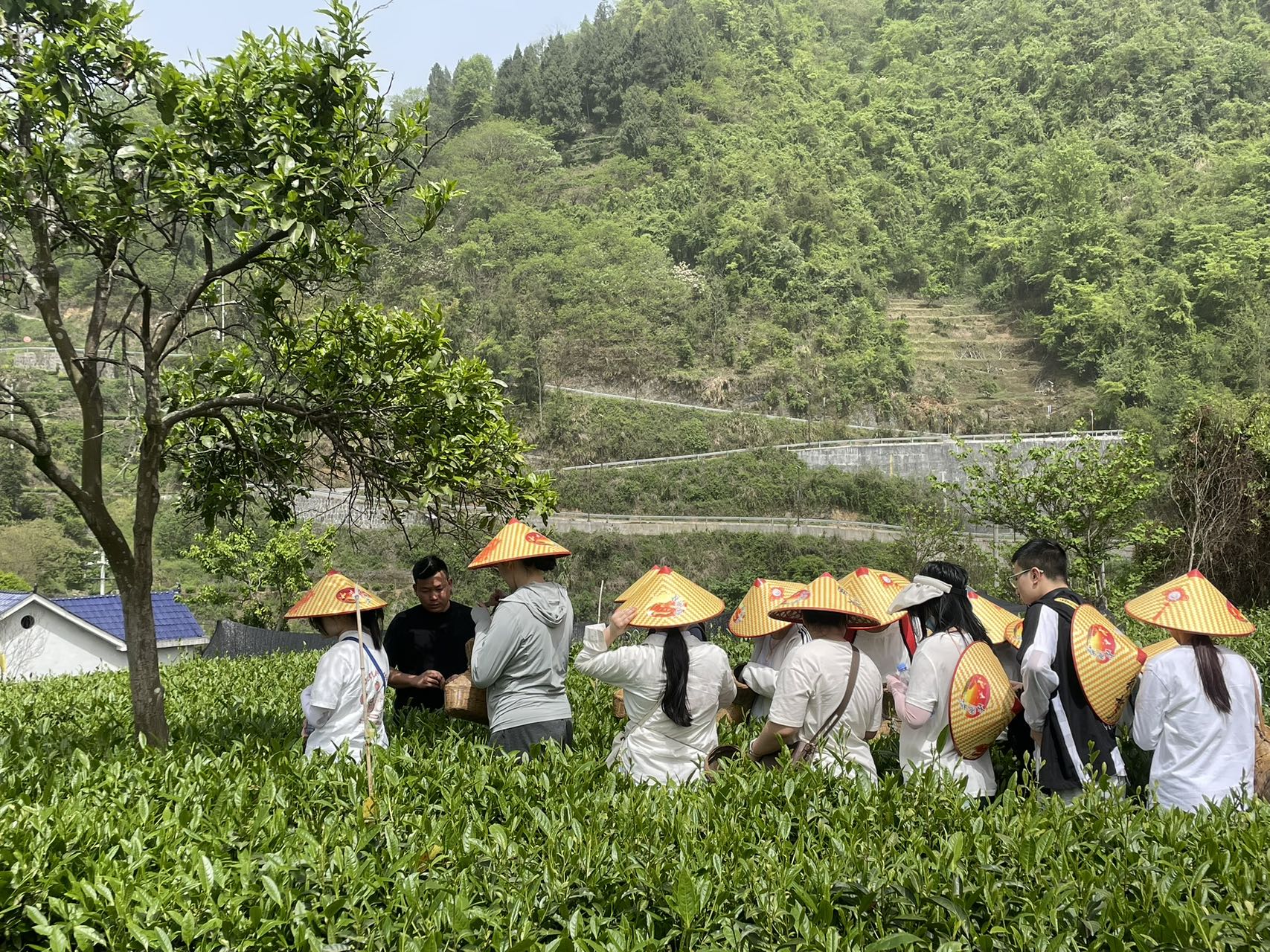 骄阳炽盛,茶山如卷。辽阔晴空下,层层碧浪接天远,新芽凝露,翠色欲滴。学子们身挎竹篓,踏青石板阶梯徐行,在茶园田垄间穿梭,躬身俯首指尖轻触嫩芽,一捻一提间,茶香染袖,恍若“掬水月在手,弄花香满衣”。“一片芽配两片叶,但一定不要图方便用指甲掐”,采茶基地师傅如是提醒,并示范;同学初来上手还觉得陌生,多次尝试也是熟能生巧,在颇显闷热的天气里发现未曾体验的乐趣……夕阳西沉,茶山逐渐归于寂静。归途大巴上,同学们依靠在座椅宽大的靠背上,指尖残留着草木汁液的清香,不时谈及个中体验,脸上洋溢着淡淡笑容,亦是觉得不虚此行。